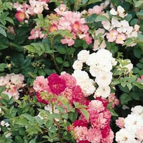Esta rosa perenne y enana crece unos 35 cm de altura y da una mezcla de flores simples y dobles en tonos rosa, rojo y blanco. Lo mejor es que florece durante un período muy largo, desde la primavera hasta que llegan las primeras heladas en el otoño.